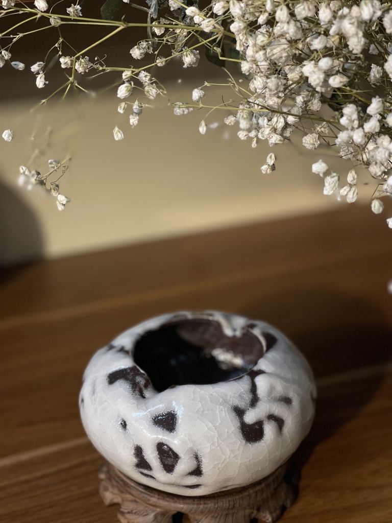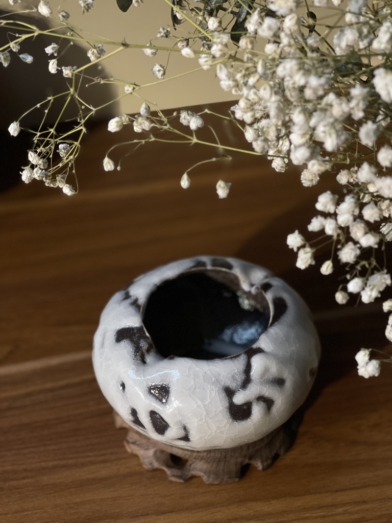 Bộ bình hoa và gạt tàn men sữa hoa đào Hagiyaki (nguyên hộp gỗ)
