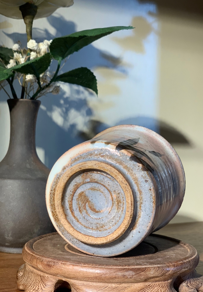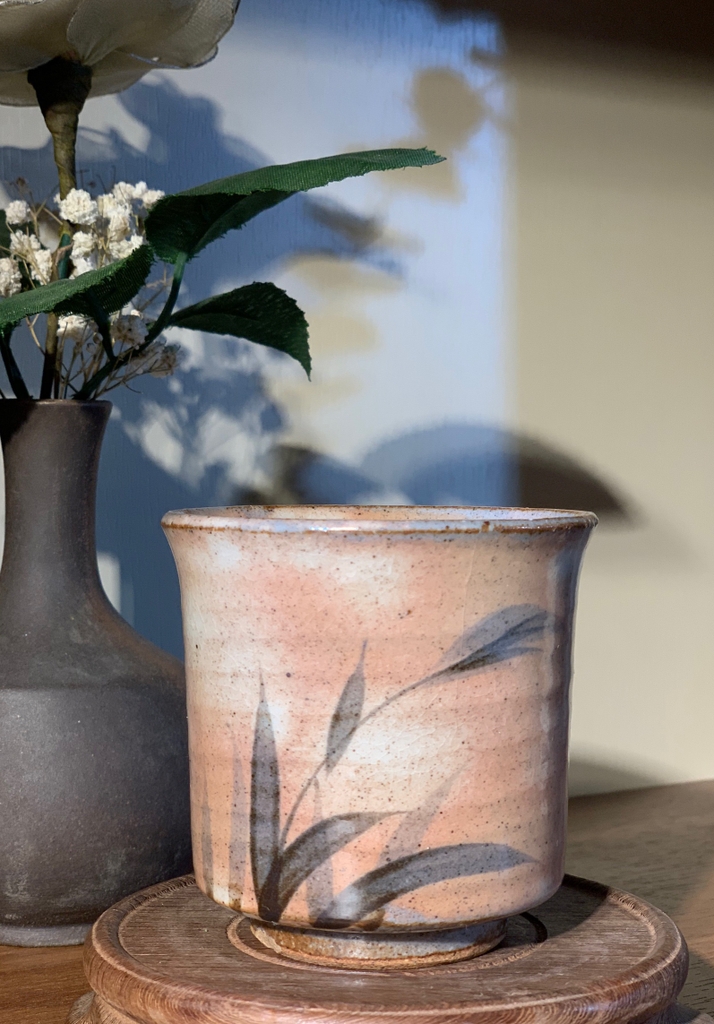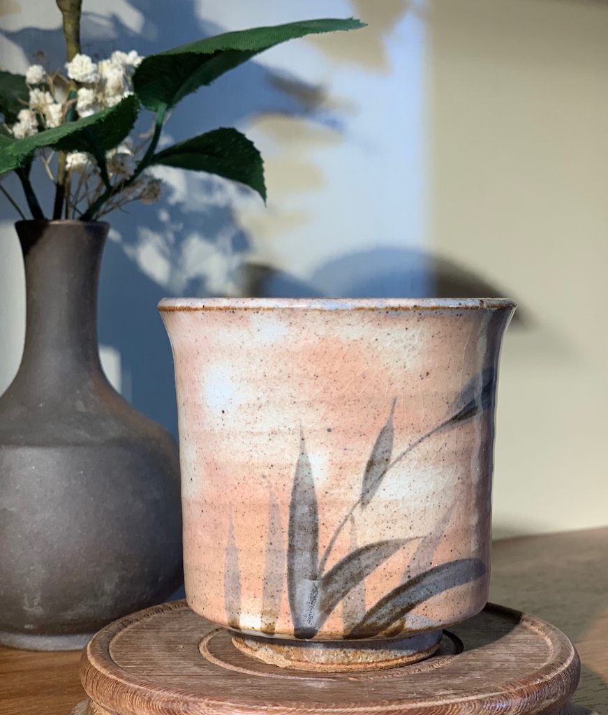 Cốc mộc tráng men hồng loang hoạ tiết lá tre