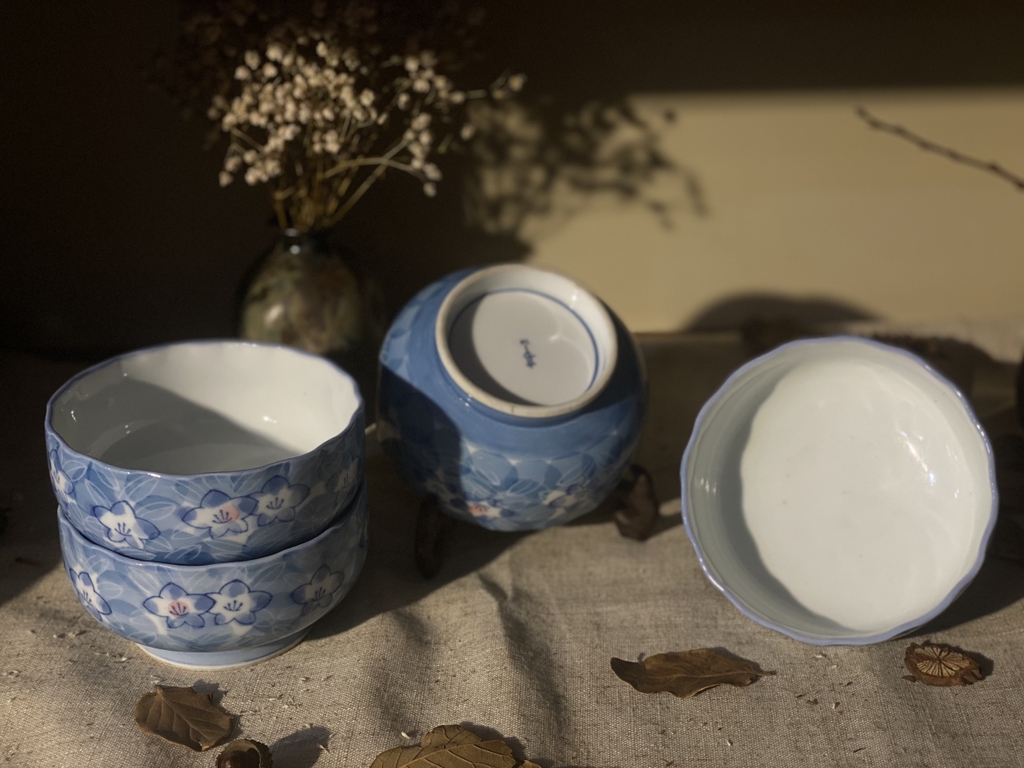 Set bát ăn cơm tráng men hoạ tiết hoa xanh 5c