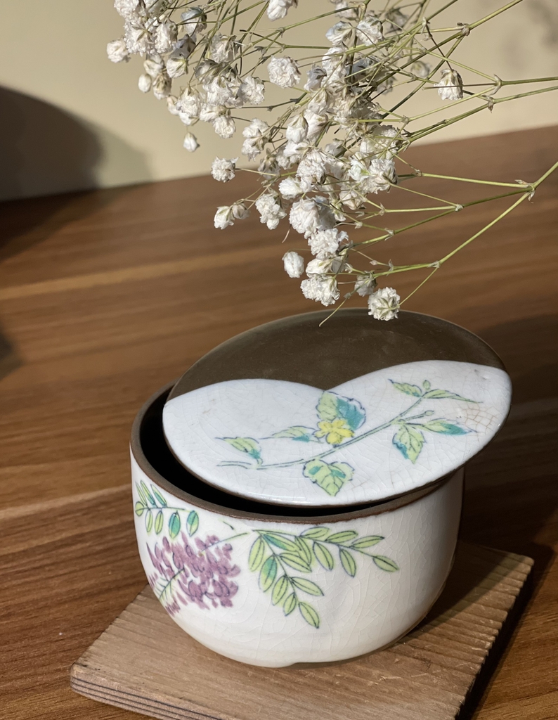 Thố mộc nâu sữa vẽ hoa có nắp